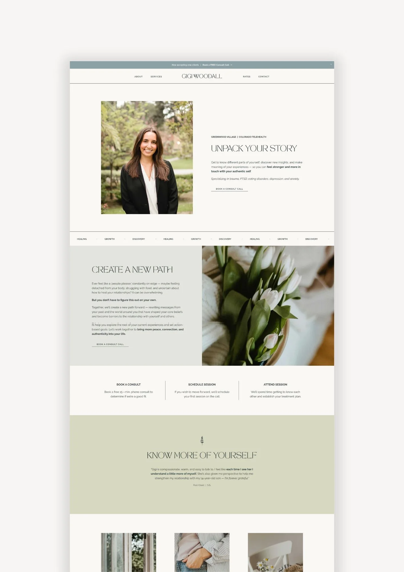 Gigi Woodall’s therapy website beautifully embodies farmhouse chic with a hint of coastal grandmother aesthetic.