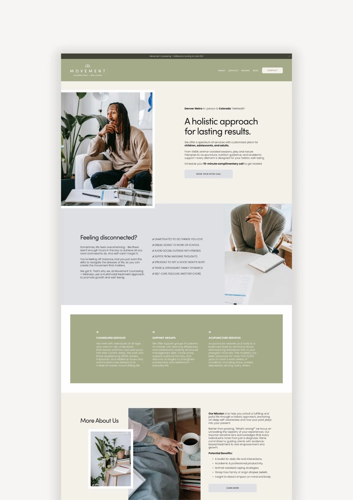 The Movement Counseling website has a holistic, calming vibe, with natural colors like sage green and desert tones that make it feel grounded and welcoming.