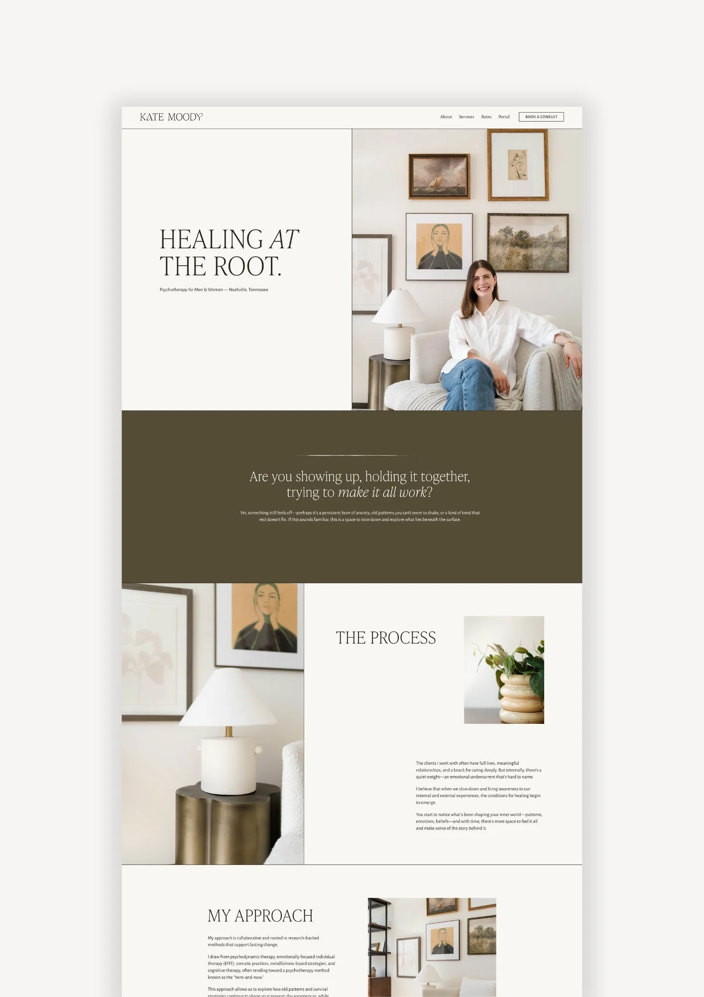 Kate Moody’s therapy website blends modern minimalism with natural textures and quiet warmth—a digital reflection of the intentional, depth-oriented therapy she offers in Nashville.